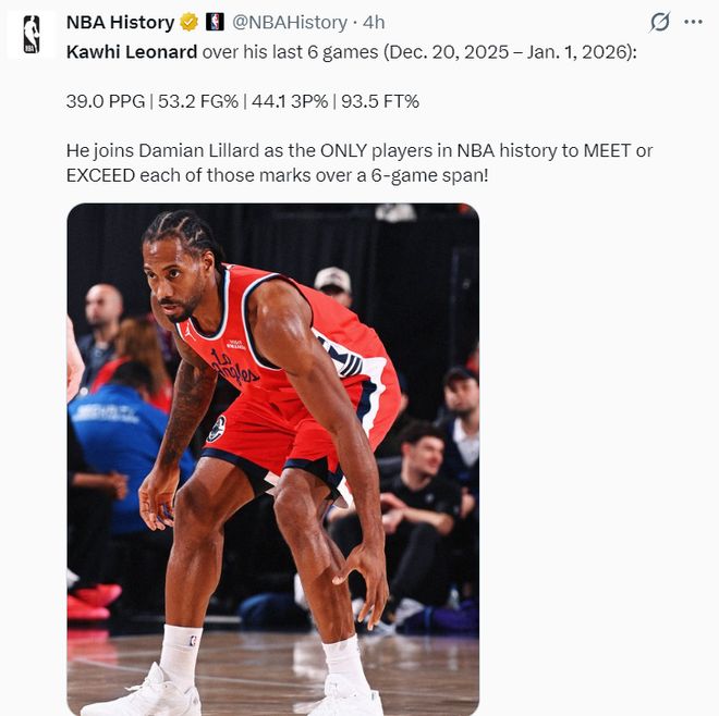 8.最近6场比赛场均39分,命中率53.3/44.1/93.5,他成为利拉德后第二位达成这样数据与命中率的球员。