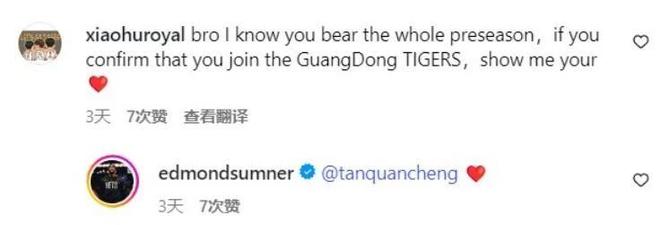 就在日前,国内两大媒体直播吧和虎扑,都公布了萨姆纳已经确定加盟广东男篮的消息。随后就有广东球迷前往萨姆纳社交媒体下询问,表示如果他确认自己将加盟广东男篮就贴一个红心出来,随后萨姆纳真的回复了一个红心表情。也就是说,萨姆纳本人已经确定,他新赛季会加盟广东男篮效力。