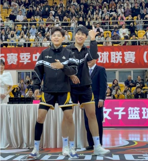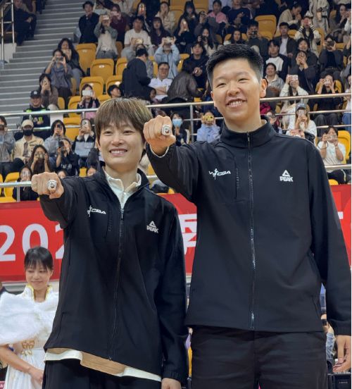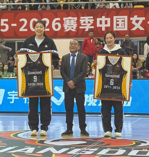 广东女篮功勋老将沈怡和于东领取总冠军戒指,并领取退役球衣。