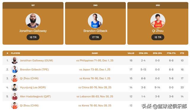 本届赛事,周琦确实发挥了他作为绝对主力的内线核心作用,单场15个篮板也排在本赛事的第三位。然而,拉胯的罚球命中率(尤其是第一场)、几乎没有的传导球能力,加上腰伤之后几乎废掉的巅峰运动能力,让周琦的统治力呈现几何式下降。